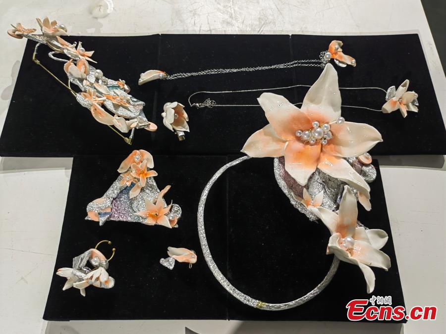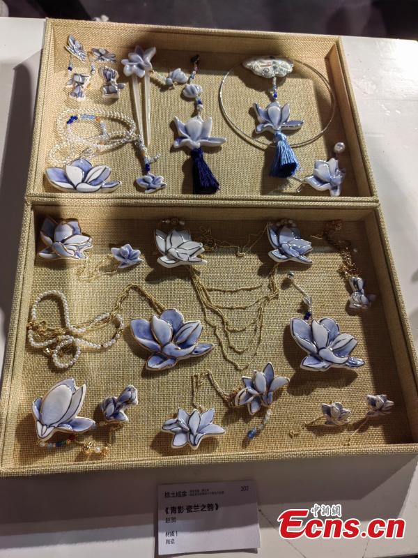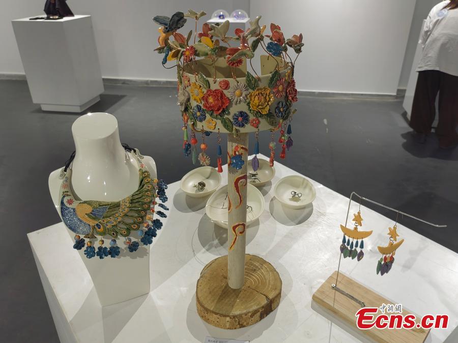 Ceramic pieces of jewelry are displayed at an exhibition in Jingdezhen, east China's Jiangxi Province. (Photo: China News Service/Li Jie)