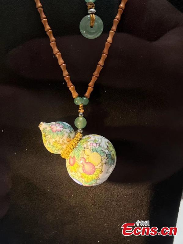 A ceramic necklace is displayed at an exhibition in Jingdezhen, east China's Jiangxi Province. (Photo: China News Service/Li Jie)