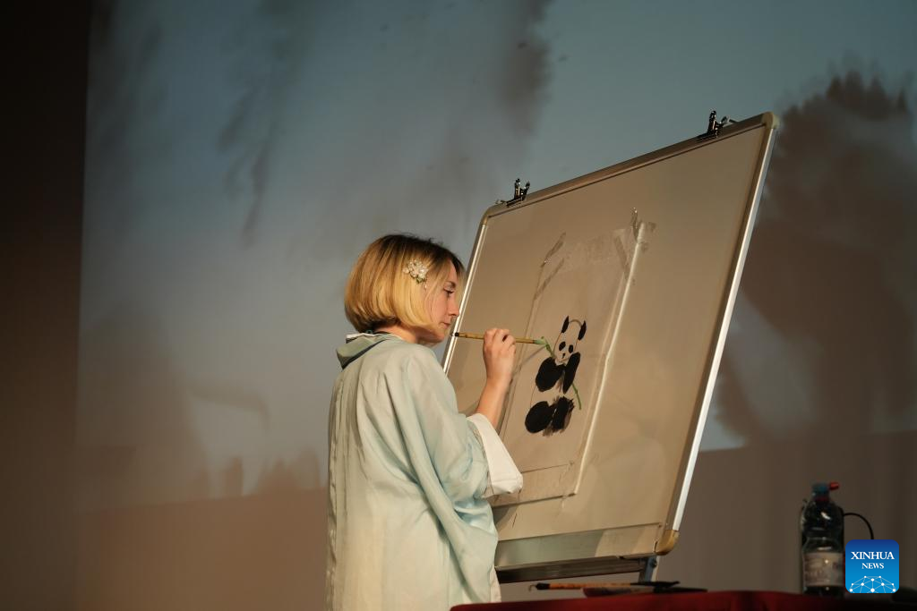 A contestant shows her talent during the 23rd Chinese Bridge-Chinese Proficiency Competition for Foreign College Students' Italy-San Marino competition in the city of Macerata, Italy, May 24, 2024. A Chinese language competition was held in Italy this week in the city of Macerata, with students from eight colleges across the country showcasing their written and oral skills over two days of activities. (Xinhua/Ren Yaoting)
