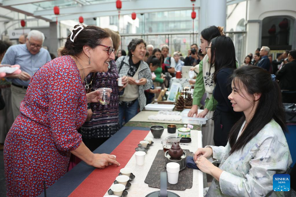 People attend the "Yaji Cultural Salon" in Brussels, Belgium, on May 24, 2024. The "Yaji Cultural Salon," or Tea for Harmony, held here Friday showcased the elegance and flavor of Yunnan tea, featuring an exhibition of its national intangible cultural heritage. (Xinhua/Zhao Dingzhe)