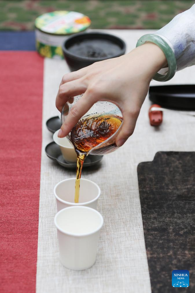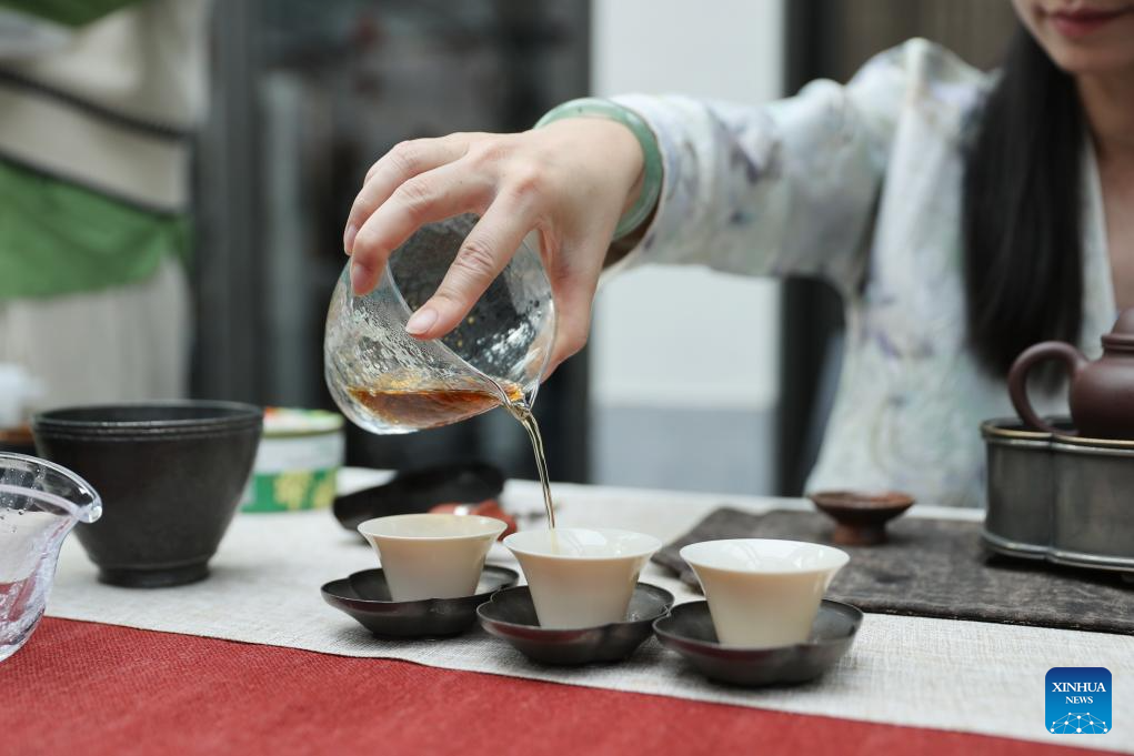 A tea specialist demonstrates tea preparation techniques during the "Yaji Cultural Salon" in Brussels, Belgium, on May 24, 2024. The "Yaji Cultural Salon," or Tea for Harmony, held here Friday showcased the elegance and flavor of Yunnan tea, featuring an exhibition of its national intangible cultural heritage. (Xinhua/Zhao Dingzhe)
