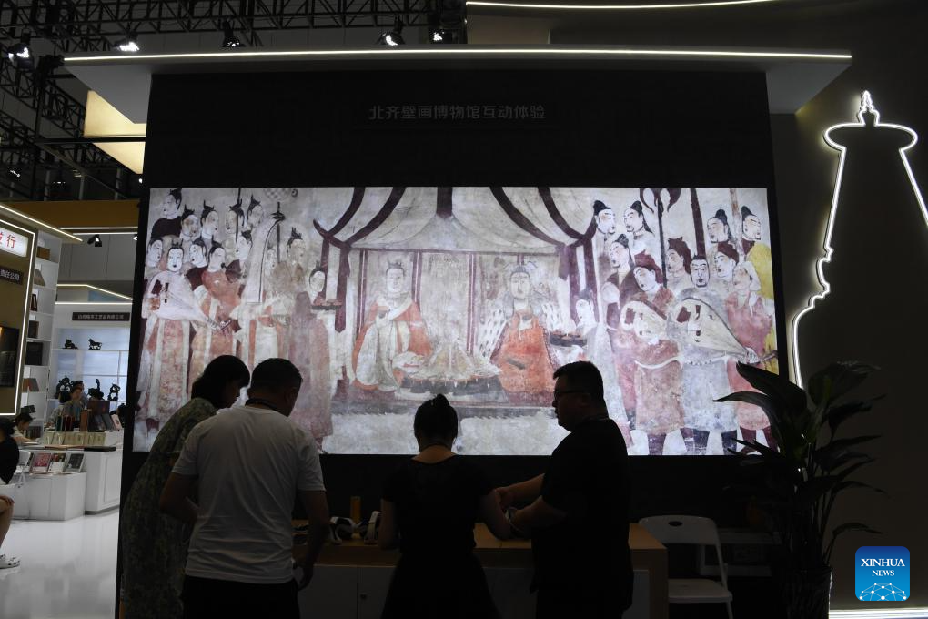 People visit a digitized interactive exhibition of ancient Chinese murals during the 20th China (Shenzhen) International Cultural Industries Fair (ICIF) in Shenzhen, south China's Guangdong Province, May 24, 2024. The 20th ICIF opened on Thursday in the southern Chinese metropolis of Shenzhen. The fair will showcase new business forms and new applications through the combination of multimedia such as AI and AR. (Xinhua/Liang Xu)