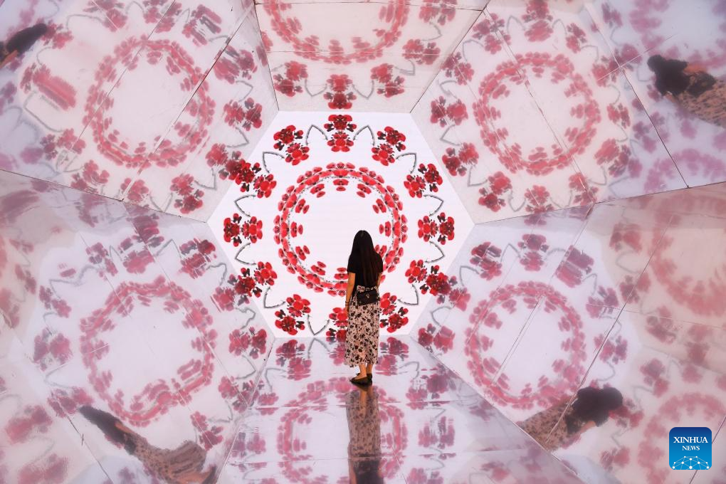 A woman visits an installation during the 20th China (Shenzhen) International Cultural Industries Fair (ICIF) in Shenzhen, south China's Guangdong Province, May 24, 2024. The 20th ICIF opened on Thursday in the southern Chinese metropolis of Shenzhen. The fair will showcase new business forms and new applications through the combination of multimedia such as AI and AR. (Xinhua/Liang Xu)