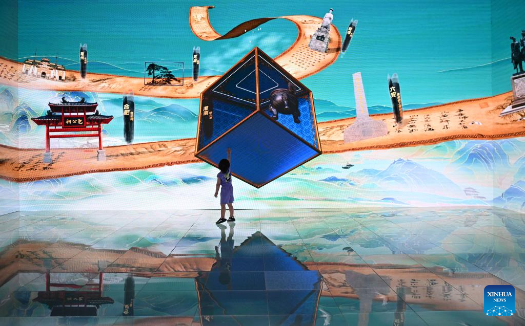 A child visits a 3D exhibition area during the 20th China (Shenzhen) International Cultural Industries Fair (ICIF) in Shenzhen, south China's Guangdong Province, May 24, 2024. The 20th ICIF opened on Thursday in the southern Chinese metropolis of Shenzhen. The fair will showcase new business forms and new applications through the combination of multimedia such as AI and AR. (Xinhua/Deng Hua)