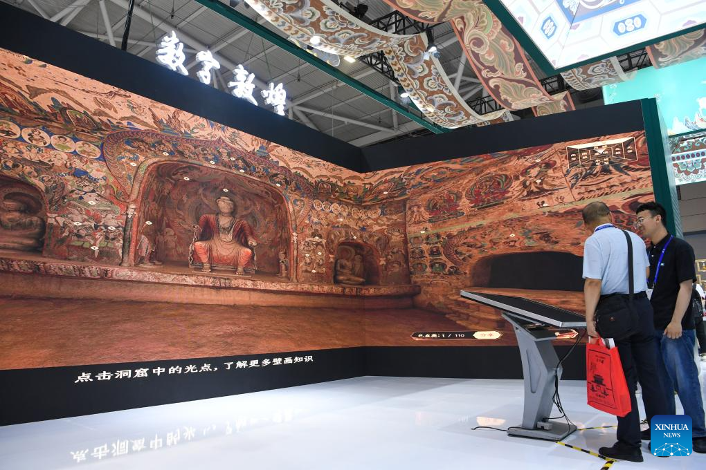 People visit an immersive digitized exhibition of ancient Chinese grottoes during the 20th China (Shenzhen) International Cultural Industries Fair (ICIF) in Shenzhen, south China's Guangdong Province, May 23, 2024. The 20th ICIF opened on Thursday in the southern Chinese metropolis of Shenzhen. The fair will showcase new business forms and new applications through the combination of multimedia such as AI and AR. (Xinhua/Liang Xu)