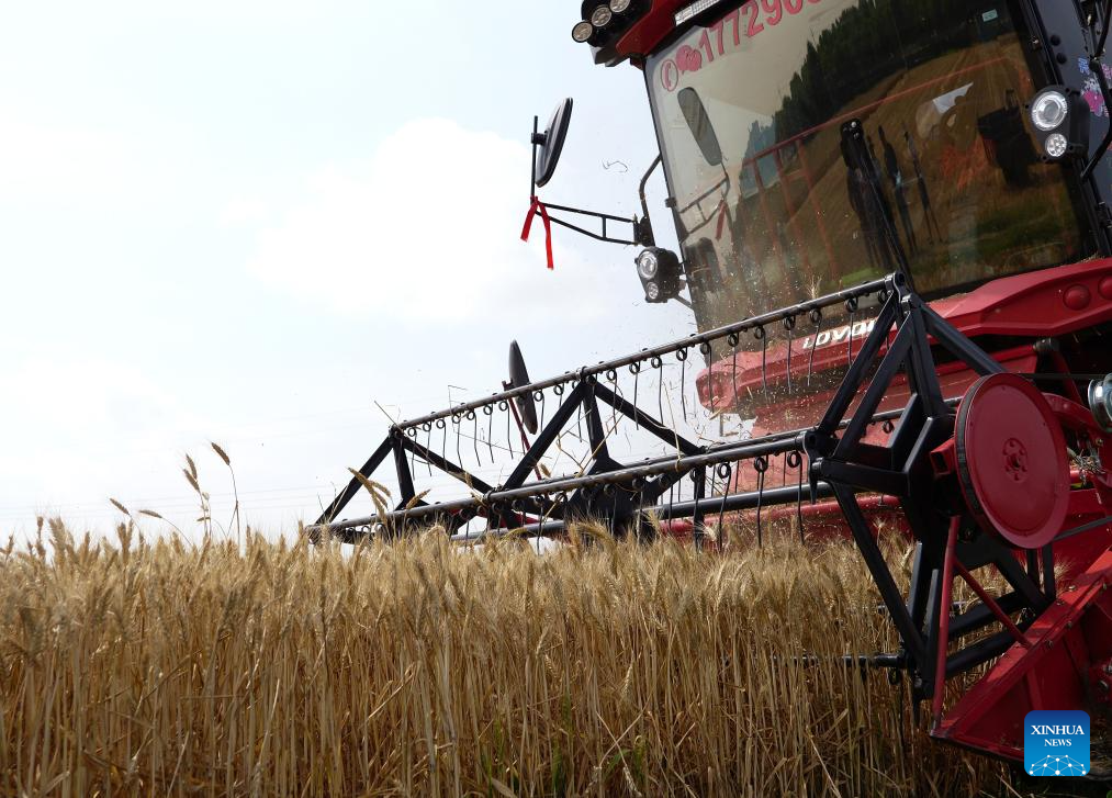 Farmers harvest wheat in the fields in Wulou Village in Shangshui County, Zhoukou City of central China's Henan Province, May 25, 2024. (Photo by Gao Jianzhong/Xinhua)