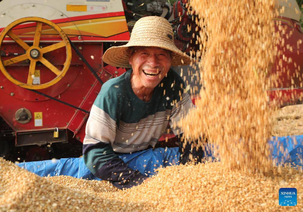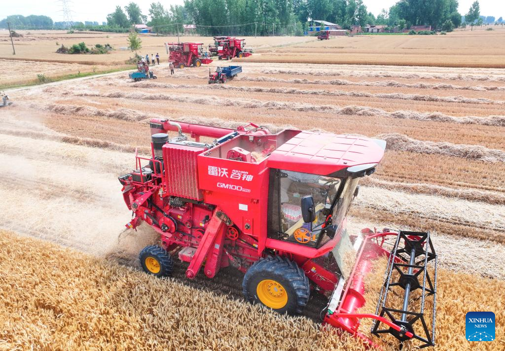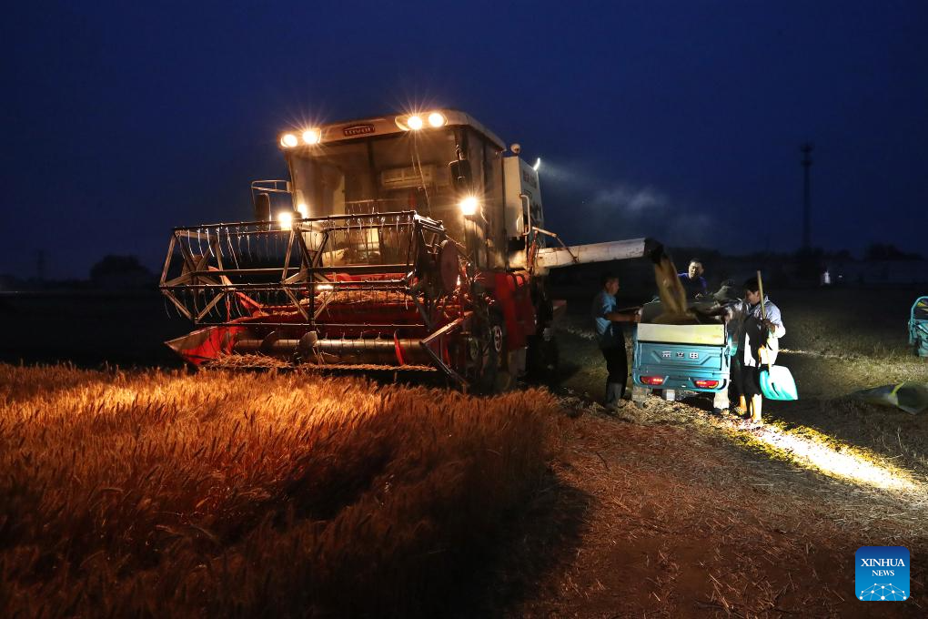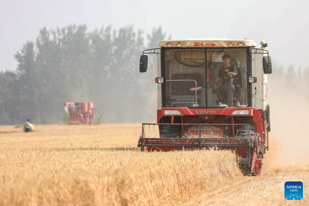 Farmers harvest wheat in the fields in Zhanglou Township in Runan County, Zhumadian City of central China's Henan Province, May 24, 2024. (Photo by Zhang Meng/Xinhua)