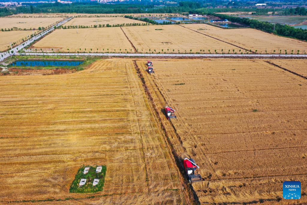 An aerial drone photo shows farmers harvesting wheat in the fields in Beidingzhuang Village in Weishi County, Kaifeng City of central China's Henan Province, May 26, 2024. (Photo by Li Xinyi/Xinhua)