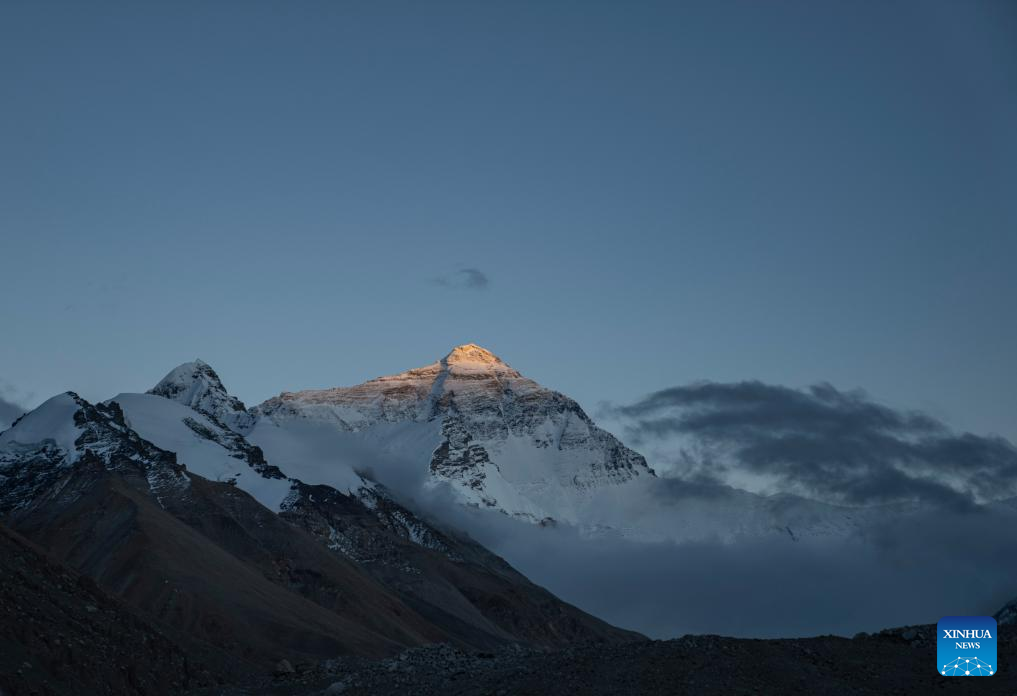 This photo taken on May 23, 2024 shows a view of the Mount Qomolangma at sunset in southwest China's Xizang Autonomous Region. The Mount Qomolangma National Park has entered peak tourism season. From Jan. 1 to May 20 this year, the Mount Qomolangma scenic spot has received about 136,000 tourists. (Xinhua/Sun Fei)