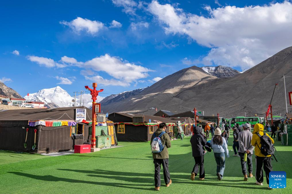 Tourists walk in a base camp of Mount Qomolangma in southwest China's Xizang Autonomous Region, May 24, 2024. The Mount Qomolangma National Park has entered peak tourism season. From Jan. 1 to May 20 this year, the Mount Qomolangma scenic spot has received about 136,000 tourists. (Xinhua/Sun Fei)