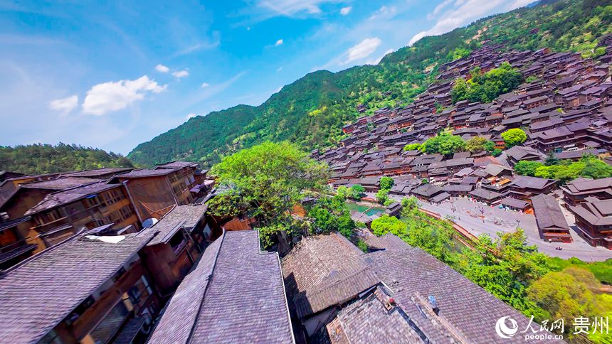 Photo shows an array of wooden stilted buildings in the Xijiang Qianhu Miao Village. (People’s Daily Online/Tu Min)