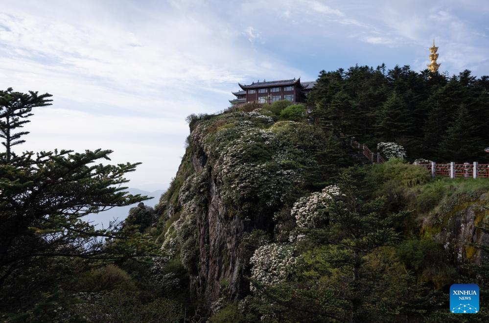 An aerial drone photo taken on May 26, 2024 shows azalea blossoms on the summit of Mount Emei in southwest China's Sichuan Province. April, May and June see the most beautiful azalea blossoms every year at Mount Emei, dubbed the "Kingdom of Azalea," home to about 30 species of this plant family. (Xinhua/Jiang Hongjing)