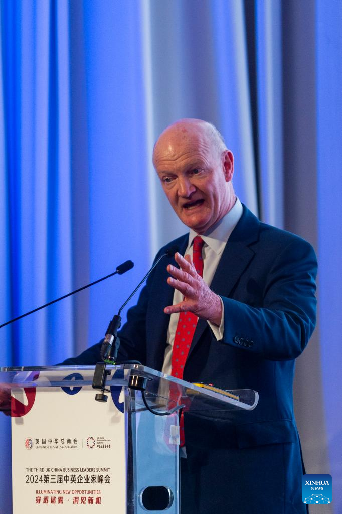 David Willetts, member of the House of Lords and former Minister of State for Universities and Science, speaks at the 3rd United Kingdom (UK)-China Business Leaders Summit in London, Britain, on May 28, 2024. Business leaders and government officials attending the ongoing 3rd United Kingdom (UK)-China Business Leaders Summit here conveyed confidence in the prospect of trade, investment and bilateral ties of the two countries. (Photo by Stephen Chung/Xinhua)
