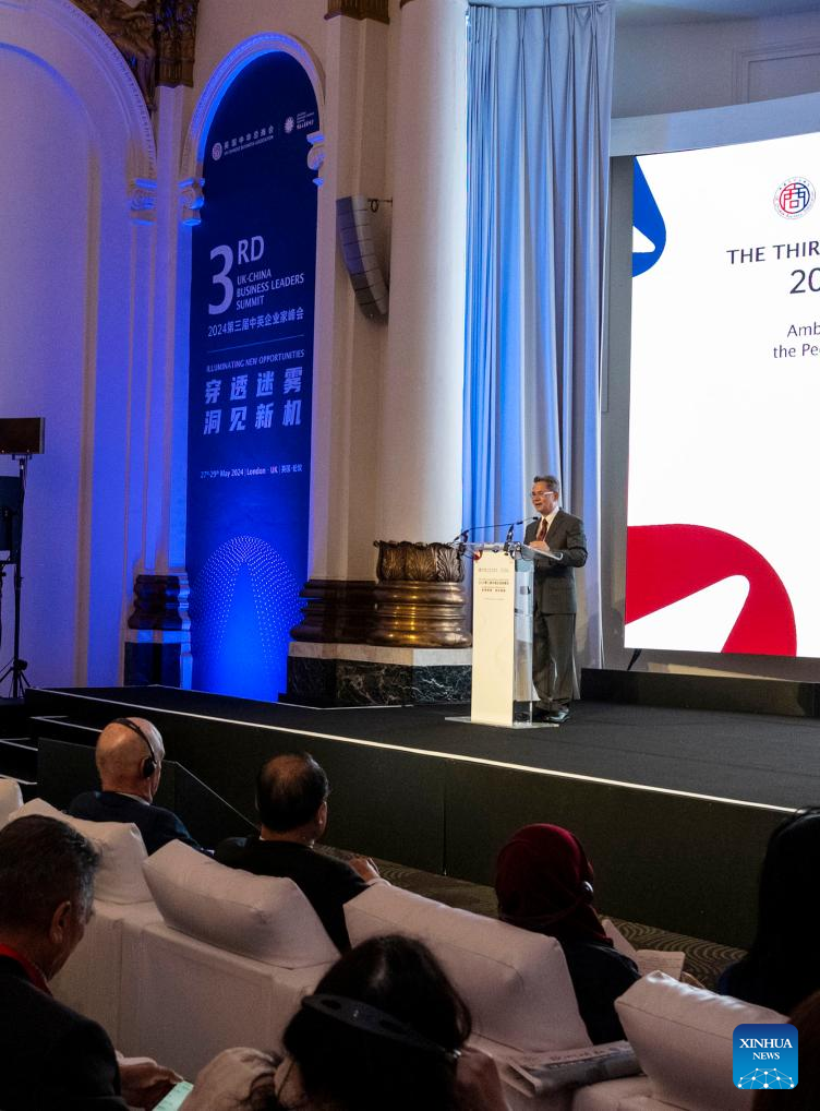 Chinese Ambassador to the UK Zheng Zeguang speaks at the 3rd United Kingdom (UK)-China Business Leaders Summit in London, Britain, on May 28, 2024. Business leaders and government officials attending the ongoing 3rd United Kingdom (UK)-China Business Leaders Summit here conveyed confidence in the prospect of trade, investment and bilateral ties of the two countries. (Photo by Stephen Chung/Xinhua)