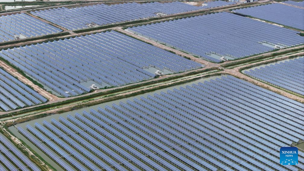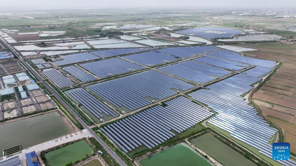 An aerial drone photo taken on May 25, 2024 shows a fishery-solar power integration project in Changxin Township of Helan County, Yinchuan City, northwest China's Ningxia Hui Autonomous Region. Helan County has been popularizing fishery-solar power integration projects as a more efficient and sustainable way to develop its fishery industry. Arrays of photovoltaic modules are set up on fishponds to avail of the generous sunlight while providing shield for the fish therein. These projects have brought extra income to local fishpond operators. (Xinhua/Wang Peng)