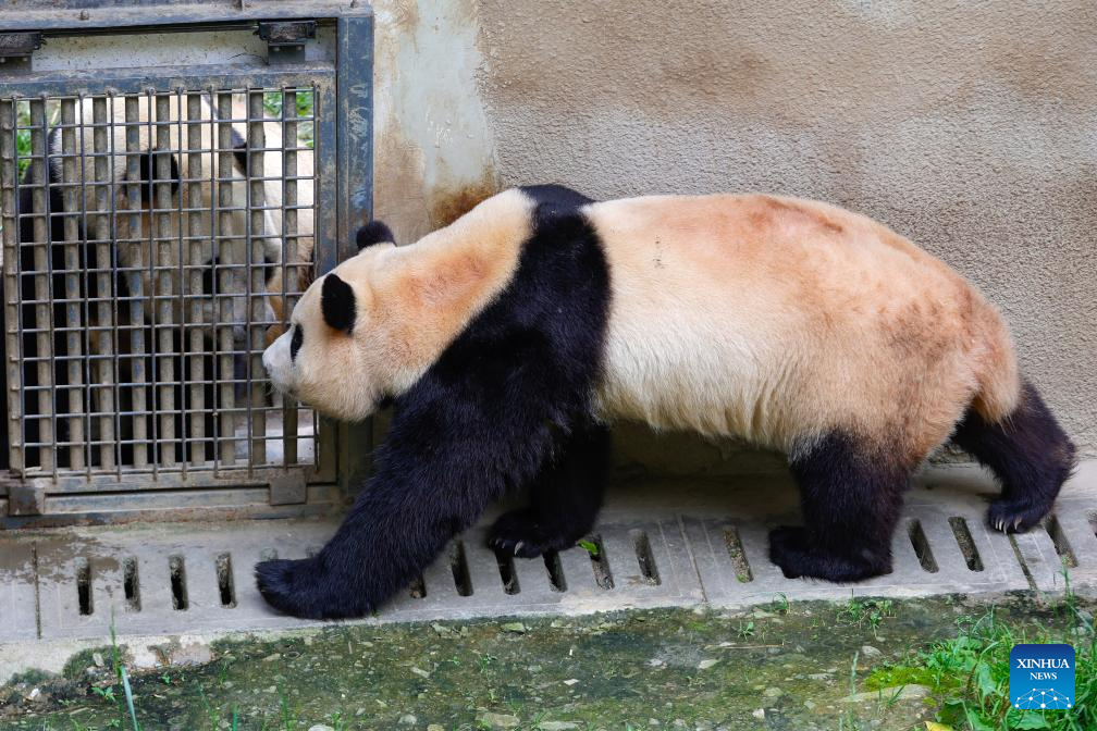 Giant panda Fu Bao wanders at the Shenshuping giant panda base in Wolong National Nature Reserve in southwest China's Sichuan Province, May 27, 2024. (Xinhua/Shen Bohan)