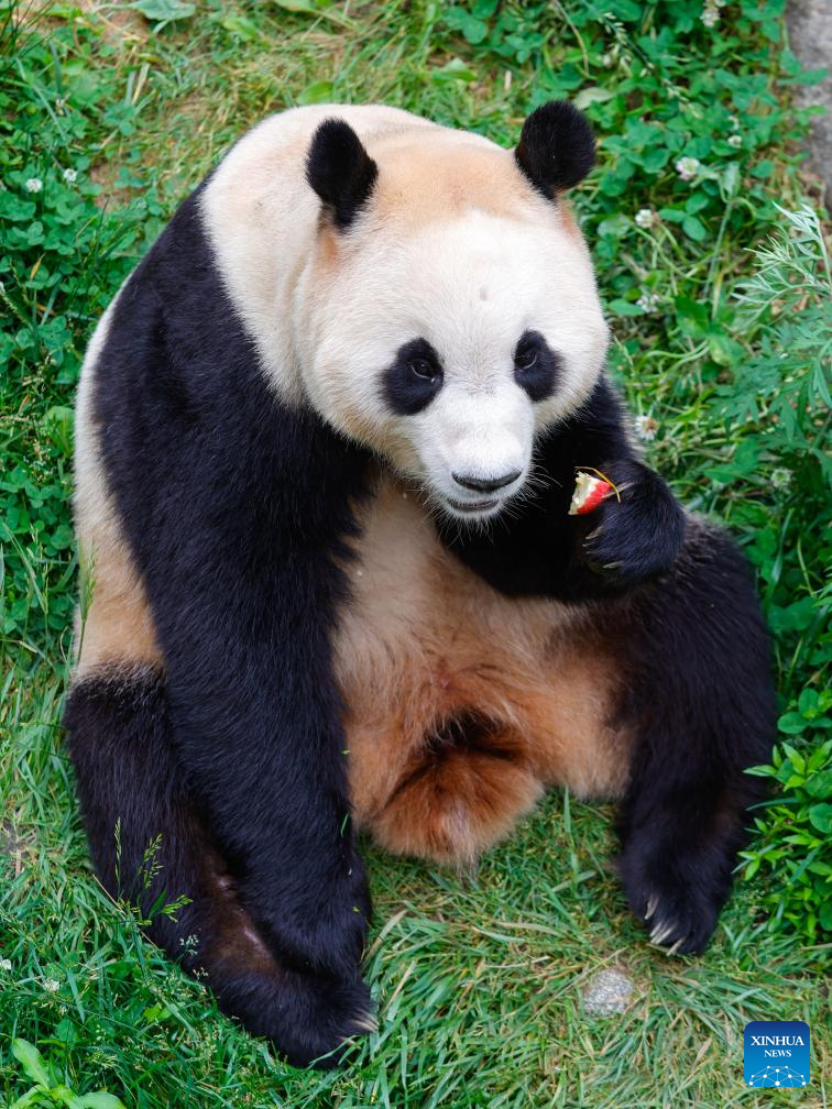 Giant panda Fu Bao eats an apple at the Shenshuping giant panda base in Wolong National Nature Reserve in southwest China's Sichuan Province, May 27, 2024. (Xinhua/Shen Bohan)