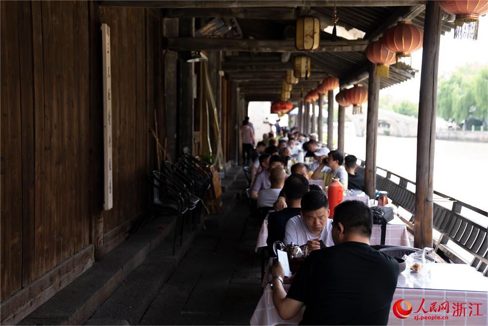 Tourists enjoy morning tea in a corridor along the Yuehe River in Jiaxing, east China's Zhejiang Province, May 26, 2024. (People's Daily Online/Ge Taiyi)