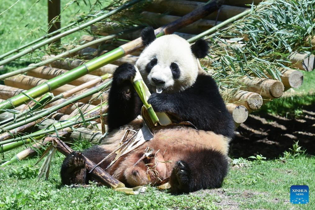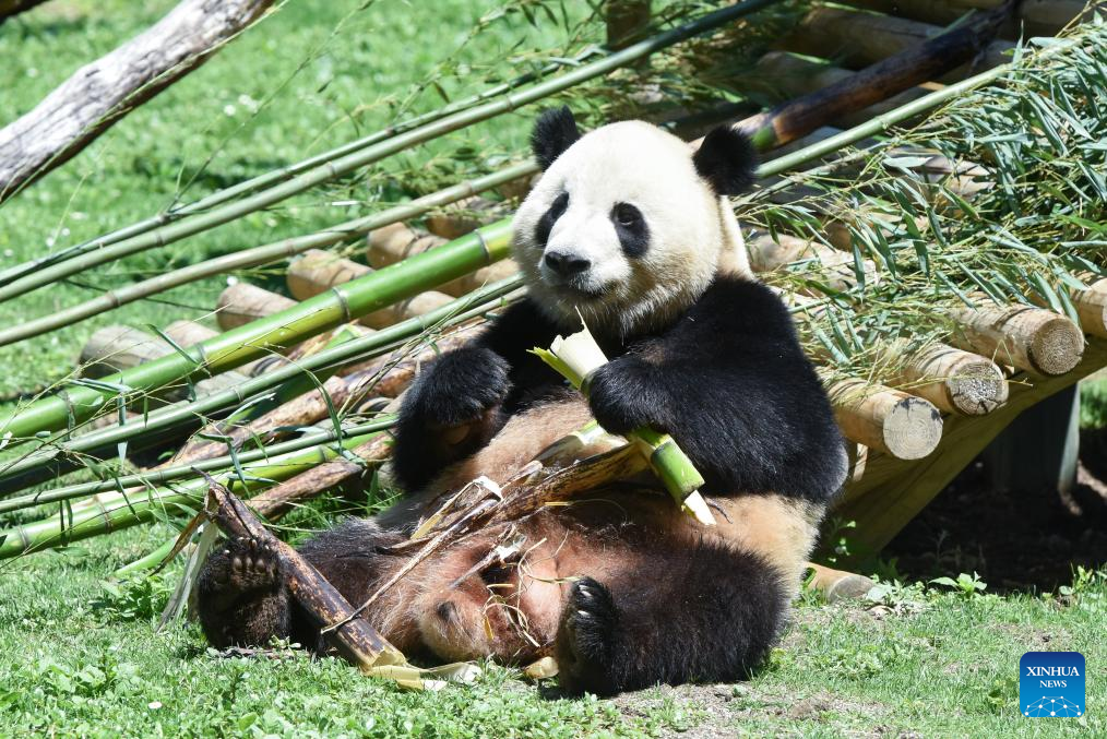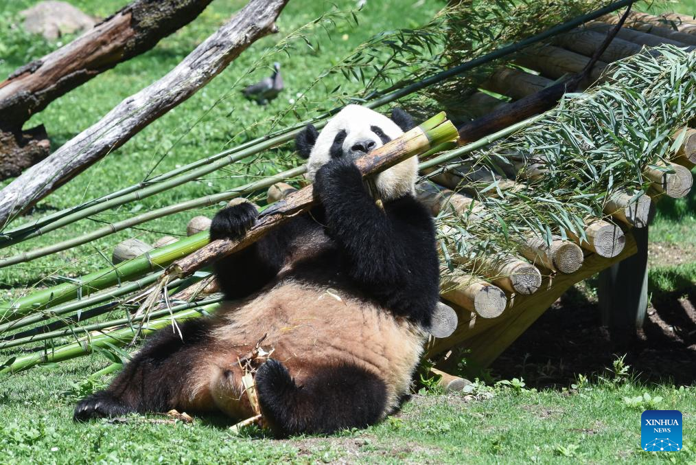 Photo taken on May 30, 2024 shows female panda Zhu Yu at Madrid Zoo in Madrid, Spain. Visitors to Spain's Madrid Zoo Aquarium were introduced Thursday to a giant panda couple from China. The new arrivals were welcomed at an official ceremony attended by authorities and experts from both countries. (Photo by Gustavo Valiente/Xinhua)