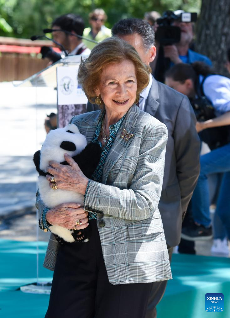 Former Spanish Queen Sofia holds a giant panda doll at Madrid Zoo in Madrid, Spain, on May 30, 2024. Visitors to Spain's Madrid Zoo Aquarium were introduced Thursday to a giant panda couple from China. The new arrivals were welcomed at an official ceremony attended by authorities and experts from both countries. (Photo by Gustavo Valiente/Xinhua)