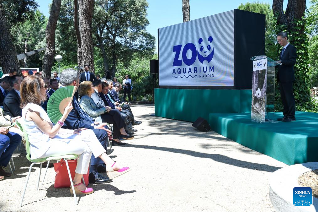 China's Ambassador to Spain Yao Jing (R) speaks at an official ceremony for a giant panda couple from China at Madrid Zoo in Madrid, Spain, on May 30, 2024. Visitors to Spain's Madrid Zoo Aquarium were introduced Thursday to a giant panda couple from China. The new arrivals were welcomed at an official ceremony attended by authorities and experts from both countries. (Photo by Gustavo Valiente/Xinhua)