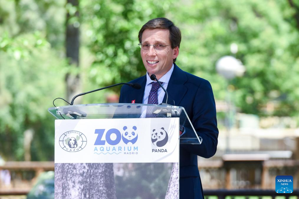 Madrid Mayor Jose Luis Martinez-Almeida speaks at an official ceremony for a giant panda couple from China at Madrid Zoo in Madrid, Spain, on May 30, 2024. Visitors to Spain's Madrid Zoo Aquarium were introduced Thursday to a giant panda couple from China. The new arrivals were welcomed at an official ceremony attended by authorities and experts from both countries. (Photo by Gustavo Valiente/Xinhua)