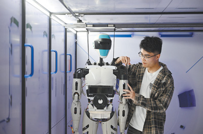 A researcher debugs a humanoid robot at a lab of Huzhou Institute of Zhejiang University in Nantaihu New Area, Huzhou city, east China's Zhejiang Province. (Photo/Huang Yangyang)