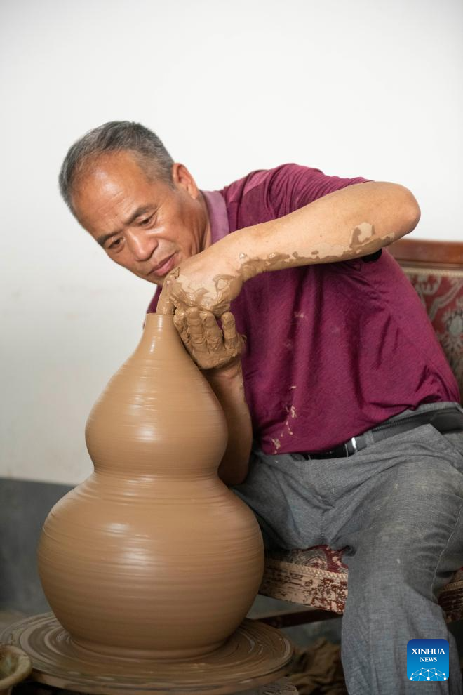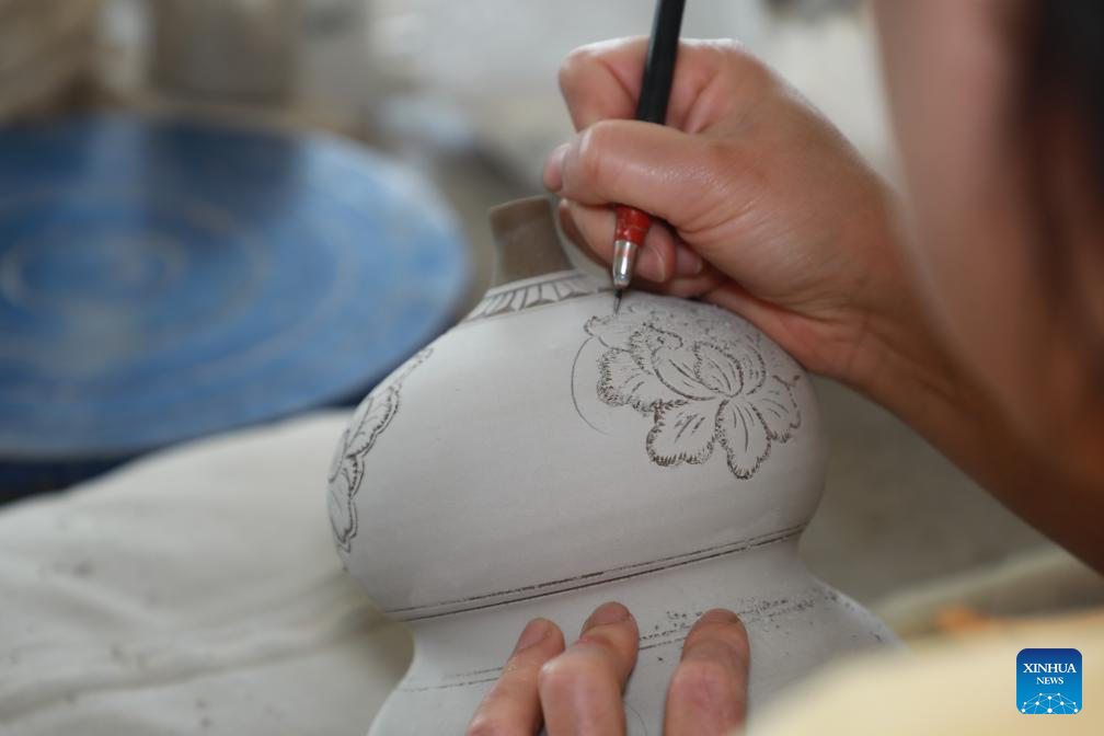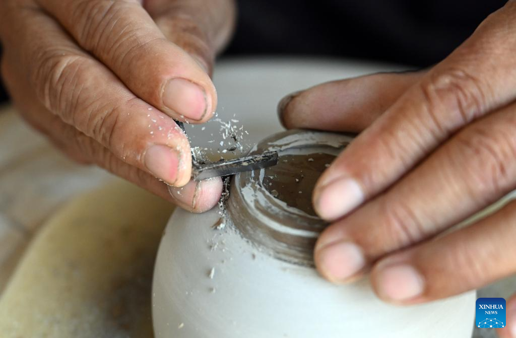 Lu Hua, a provincial inheritor of Jieshou painted pottery, makes a painted pottery craft at Jieshou City in east China's Anhui Province, May 24, 2024. (Xinhua/Zhou Mu)