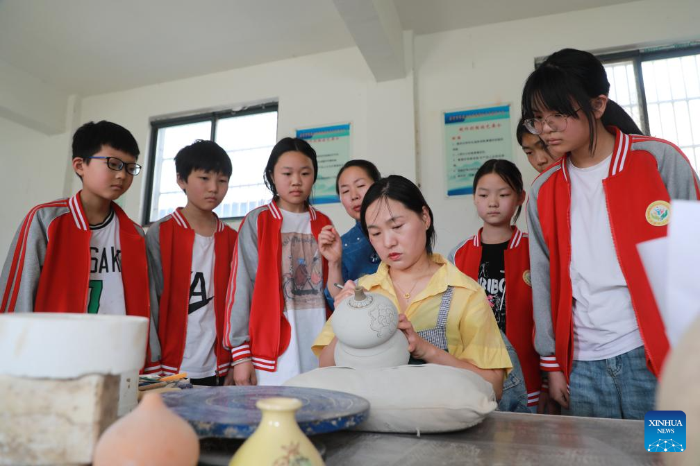 Students learn about Jieshou painted pottery making at Fuyang Science and Engineering School in Jieshou City of east China's Anhui Province, May 24, 2024. (Xinhua/Zhou Mu)