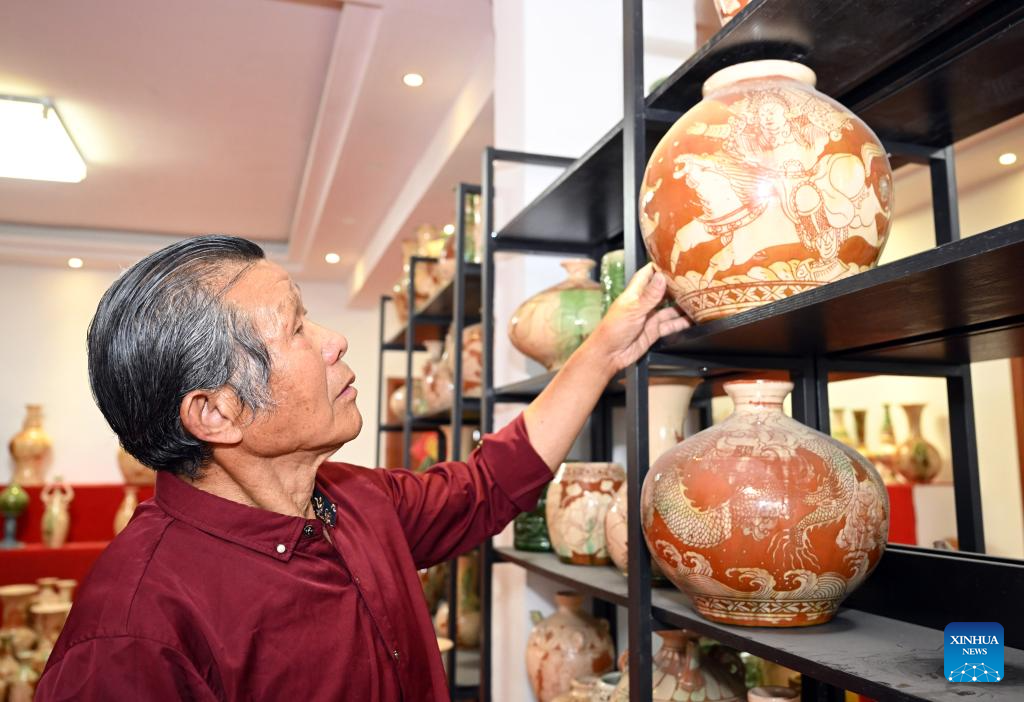 Lu Qunshan, a national inheritor of Jieshou painted pottery, introduces painted pottery works at Jieshou City in east China's Anhui Province, May 24, 2024. (Xinhua/Zhou Mu)