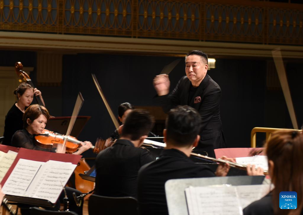 Conductor Hu Yongyan performs during a concert of Contemporary Chamber Music of China, in Vienna, Austria, on May 31, 2024. (Xinhua/He Canling)