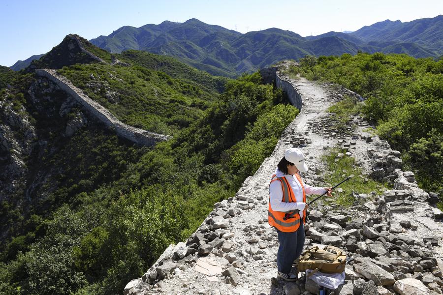 Liu Hongyan, a Great Wall protector, patrols on the Great Wall in Shixia Village in Yanqing District of Beijing, capital of China, June 1, 2024. (Xinhua/Chen Zhonghao)
