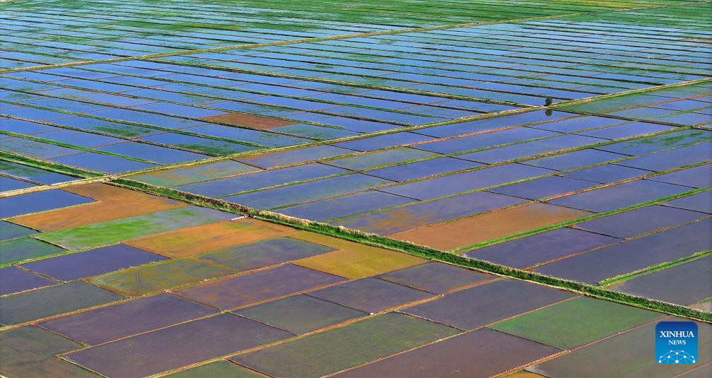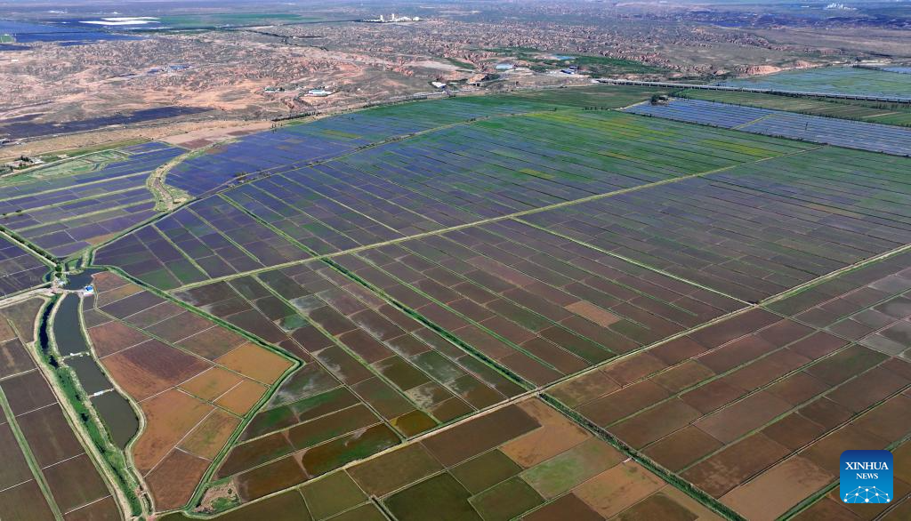 An aerial drone photo taken on May 30, 2024 shows the paddy fields along the Yellow River in Yinchuan, northwest China's Ningxia Hui Autonomous Region. This rice planting season has drawn to an end. Abundant supply of water and sunshine in June injects extra vigor into these newly planted seedlings. (Xinhua/Wang Peng)