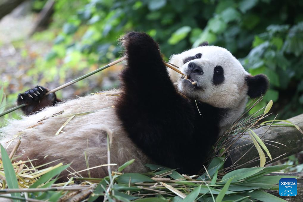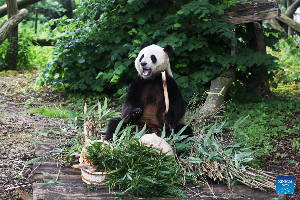Giant panda Tian Bao enjoys a birthday meal at the Pairi Daiza Zoo in Brugelette, Belgium, June 2, 2024. The Belgian Pairi Daiza Zoo celebrated the 8th birthday of giant panda Tian Bao on Sunday. (Xinhua/Zhao Dingzhe)