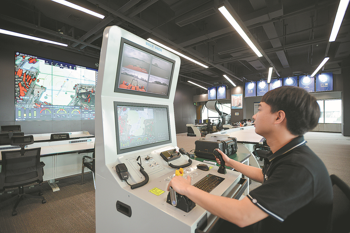 Employees work at the shore-based command center of Yunzhou Tech, a developer of unmanned surface vehicles, in Zhuhai, Guangdong, on May 20. LI RENZI/XINHUA