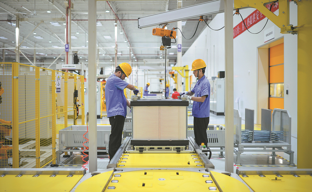 Employees work on the production line of WeView's Gigawatt-class zinc-iron flow battery "Super G Factory" in Zhuhai, Guangdong, on May 19. LI RENZI/XINHUA