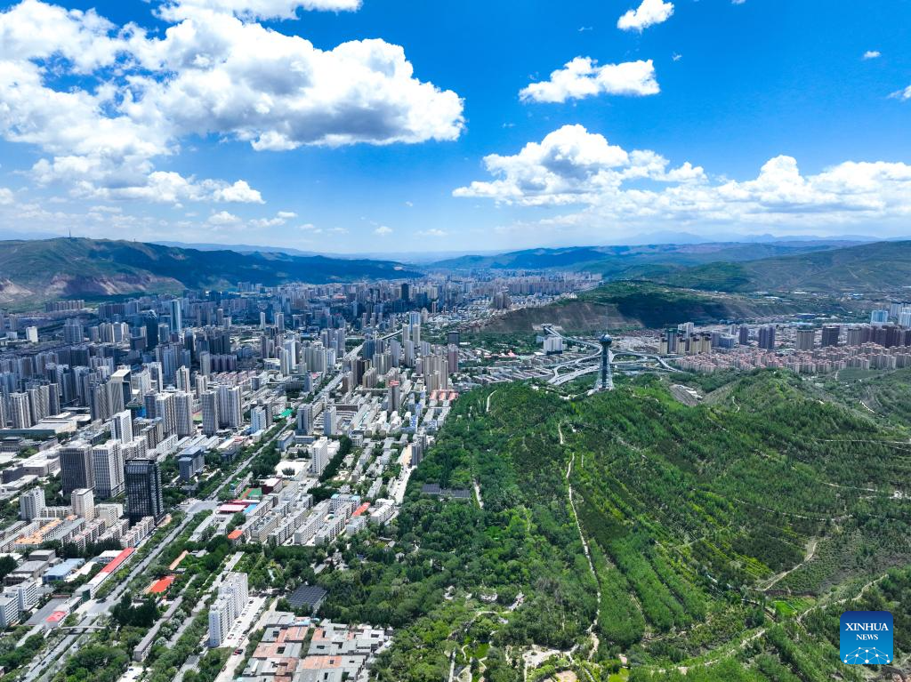 An aerial drone photo taken on June 4, 2024 shows a view of Xining, capital of northwest China's Qinghai Province. Urban ecosystem in Xining has greatly improved thanks to landscaping efforts in recent years, and the city is also more and more habitable. (Xinhua/Zhang Long)