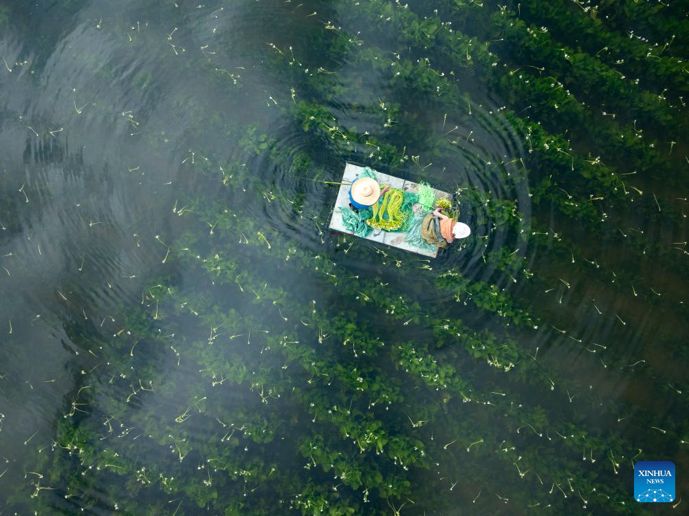 An aerial drone photo taken on June 5, 2024 shows villagers harvesting ottelia acuminata flowers at an ottelia acuminata planting base in Eryuan County of Dali Bai Autonomous Prefecture, southwest China's Yunnan Province. Ottelia acuminata only lives in fresh water of high quality, and is viewed as an indicator species of the natural environment. Its flowers are taken as an important food ingredient for people of the Bai ethnic group in southwest China. (Photo by Luo Xincai/Xinhua)