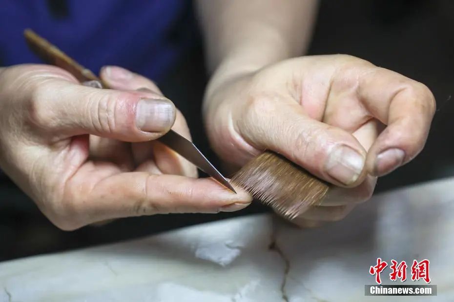 A craftsman makes a calligraphy brush in Wengang township, Jinxian county, Nanchang city, east China's Jiangxi Province. (Photo/Liu Lixin)