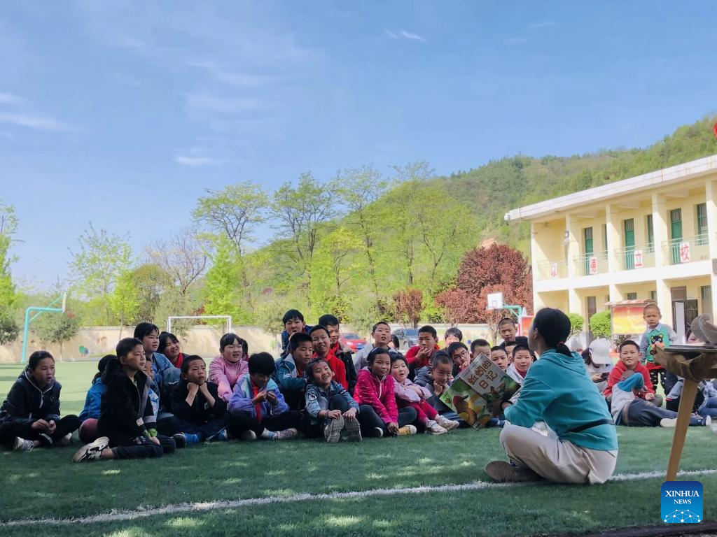 This photo taken on April 1, 2024 shows Jiao Meining giving a picture book class at a primary school in Lintong District of Xi'an, northwest China's Shaanxi Province. (Xinhua)