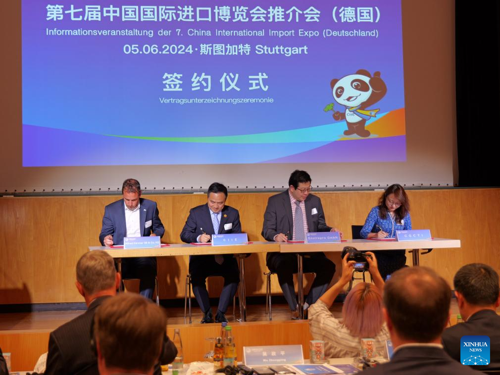 German and Chinese representatives sign a memorandum of cooperation at a promotion event for the seventh China International Import Expo (CIIE) in Stuttgart, Germany, June 5, 2024.?(Xinhua/Jia Jinming)