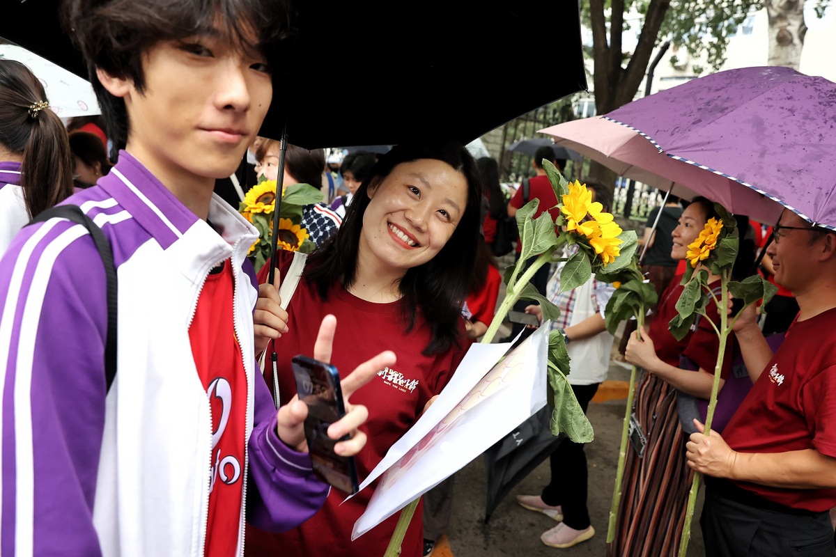 Teachers encourage their students who are about to take the national college entrance exam, or gaokao, at the Wangjing Campus of Beijing No 80 High School on June 7, 2024. [Photo by Jiang Dong/chinadaily.com.cn]