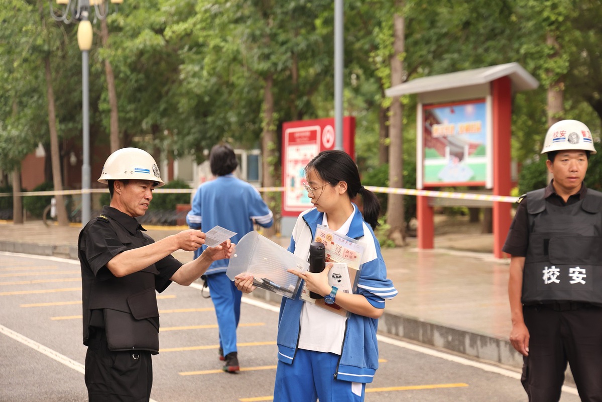 A staff member checks the admission ticket of a student at the Chaoyang Campus of High School Affiliated to Renmin University on June 7, 2024. [Photo by Wang Jing/chinadaily.com.cn]