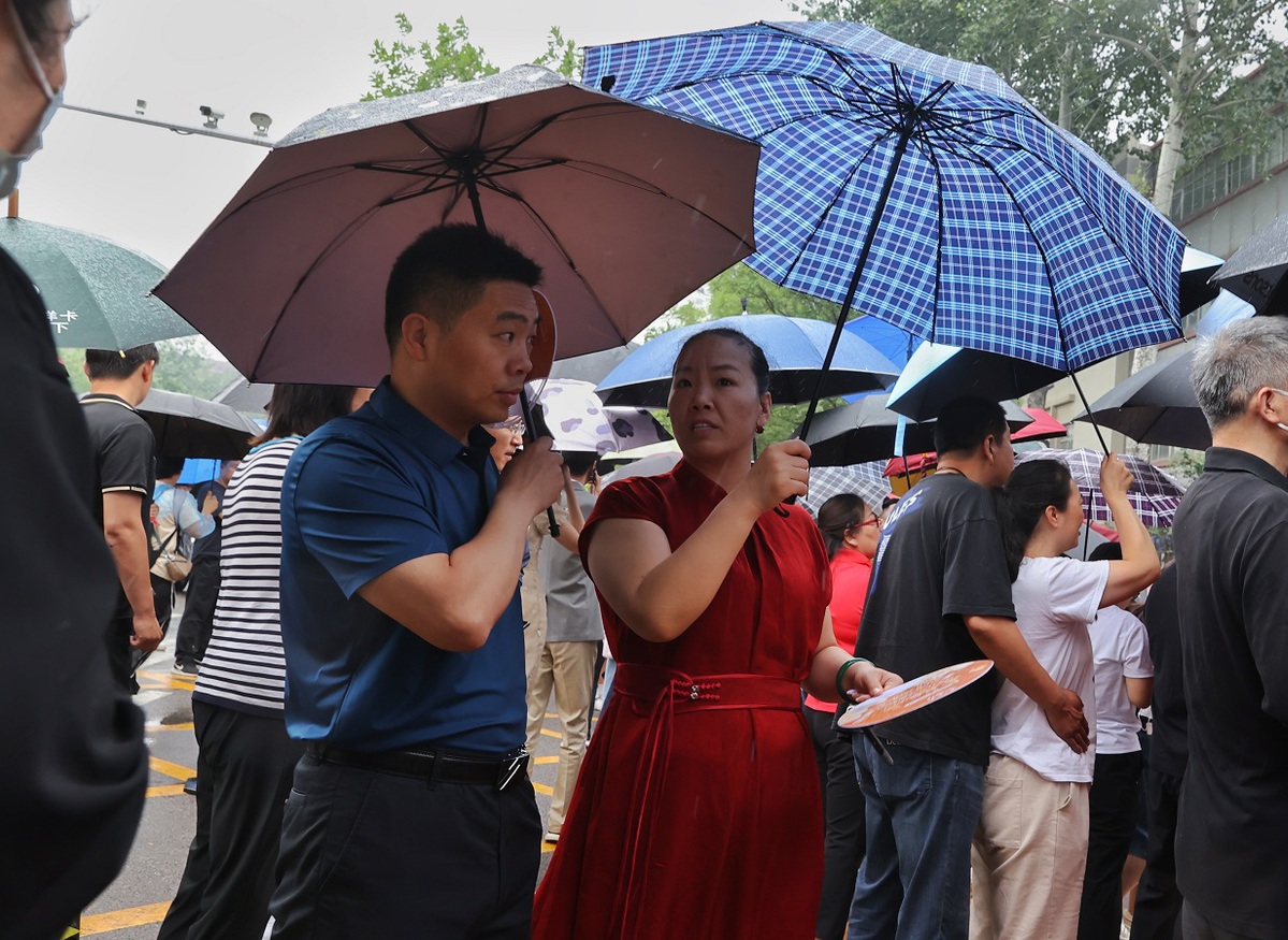 Parents wait expectantly outside the Wangjing Campus of Beijing No 80 High School on June 7, 2024. [Photo by Jiang Dong/chinadaily.com.cn]