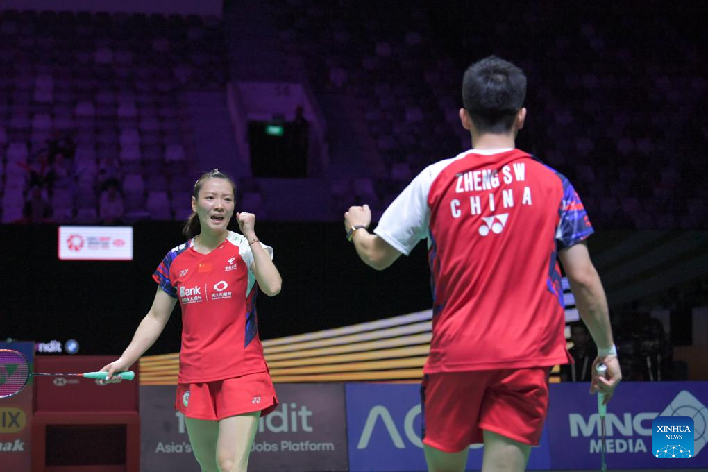 Zheng Siwei (R)/Huang Yaqiong compete during the mixed doubles quarterfinal match between Zheng Siwei/Huang Yaqiong of China and Tang Chun Man/Tse Ying Suet of China's Hong Kong at 2024 Indonesia Open badminton tournament in Jakarta, Indonesia, June 7, 2024. (Xinhua/Xu Qin)