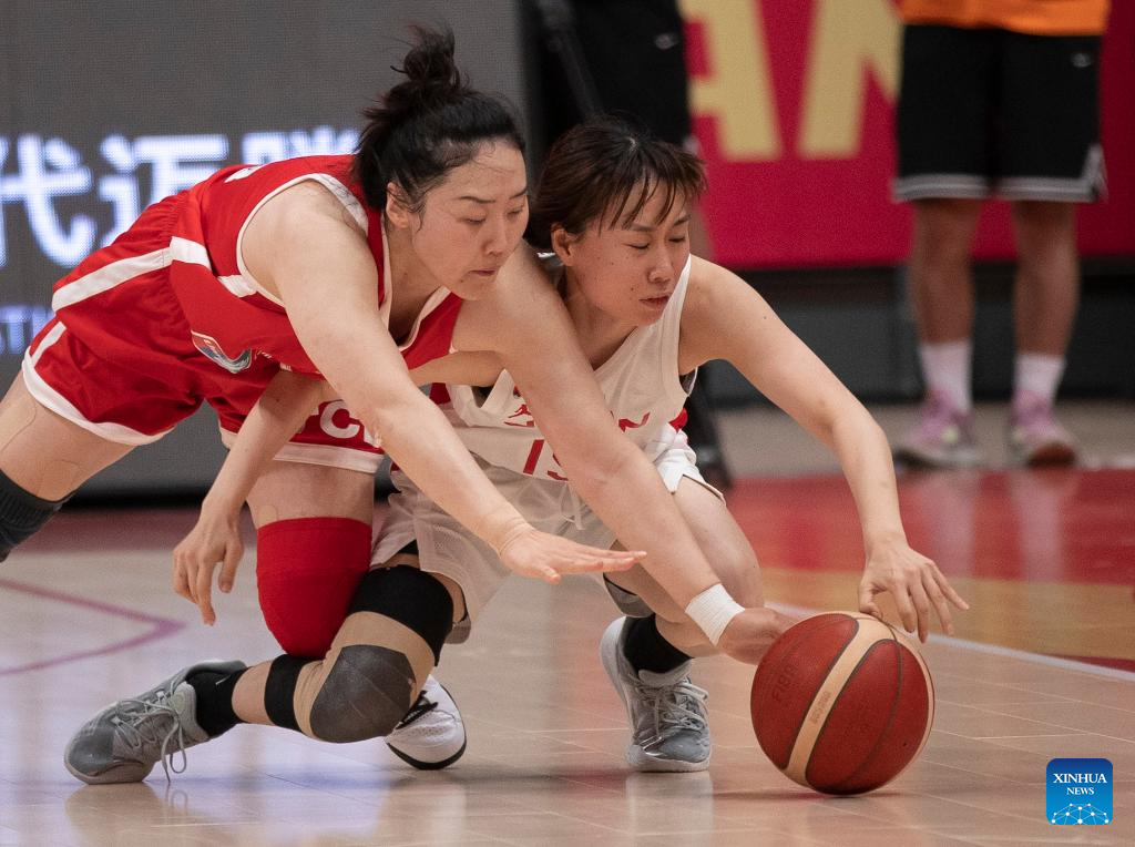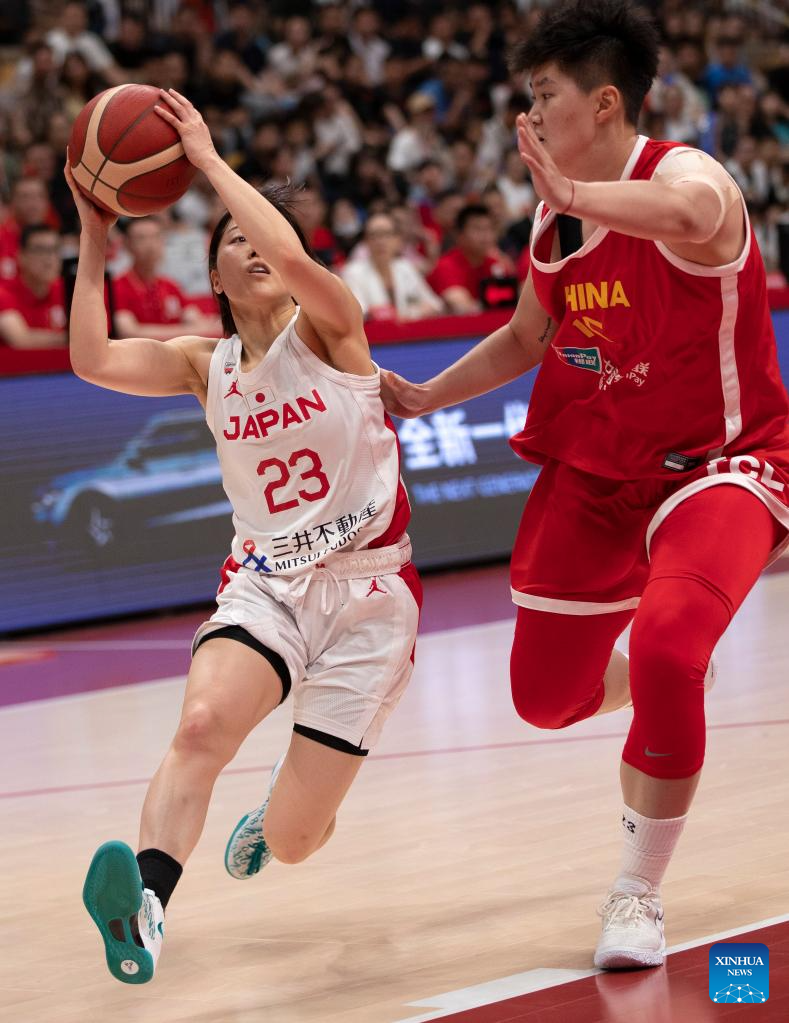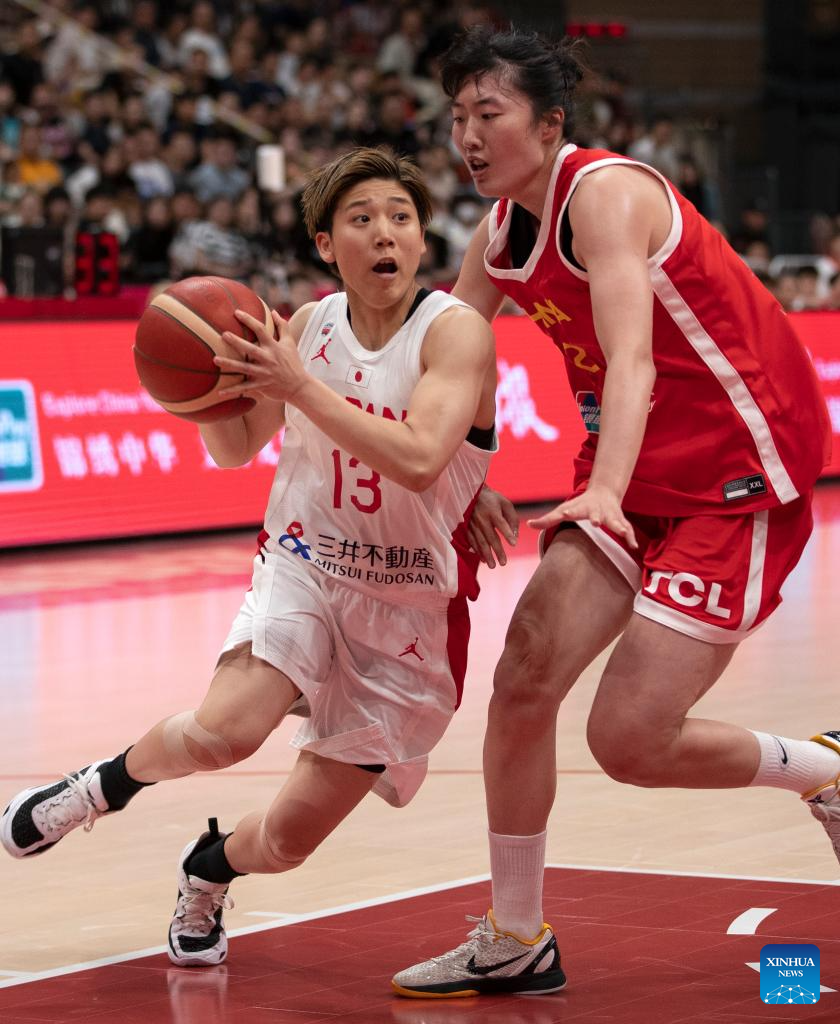 Zhang Ru (R) of China vies with Miyazaki Saori of Japan during a friendly match between China and Japan at the women's basketball pre-Olympic warm-up series in Xi'an, northwest China's Shaanxi Province, June 7, 2024. (Xinhua/Luo Yuan)