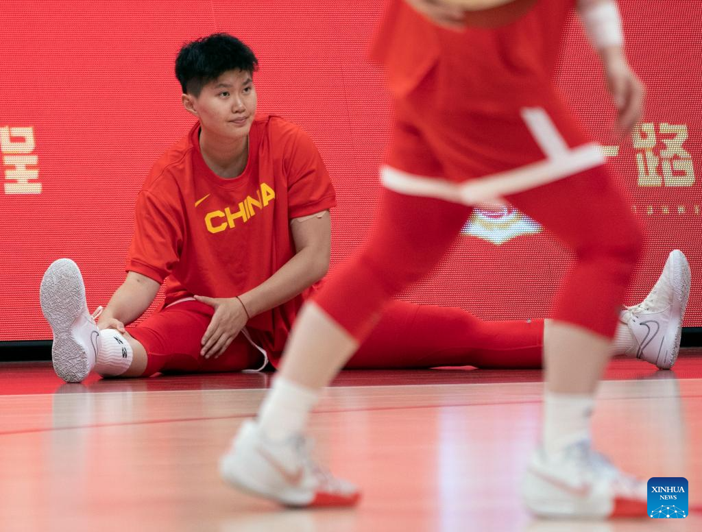 Tang Yu of China warms up before a friendly match between China and Japan at the women's basketball pre-Olympic warm-up series in Xi'an, northwest China's Shaanxi Province, June 7, 2024. (Xinhua/Luo Yuan)