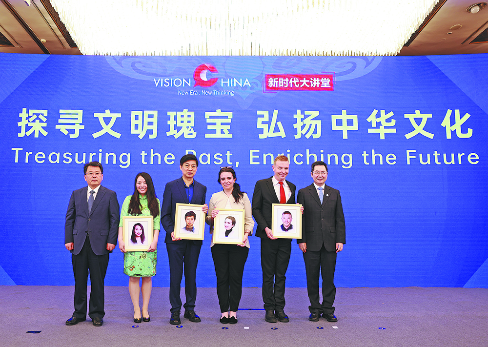 Guest speakers receive souvenir portraits after sharing their insights on exploring and protecting Chinese culture at a Vision China event in Jinzhou, Liaoning province, on Sunday. FENG YONGBIN/CHINA DAILY