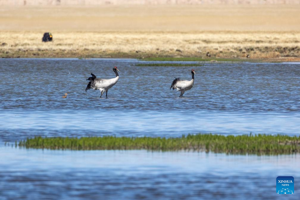 Two black-necked cranes and their baby are seen at a wetland in Xainza County of Nagqu City, southwest China's Xizang Autonomous Region, June 9, 2024. Black-necked crane couples are breeding babies in wetlands at an altitude of about 4,700 meters in Xainza County. Every year around the time of June, pairs of black-necked cranes migrate to Xainza County to hatch eggs on grass piers surrounded by water. The black-necked crane, a species under first-class state protection in China, mainly inhabits plateau meadows and marshes at an altitude of 2,500 to 5,000 meters. (Xinhua/Jiang Fan)