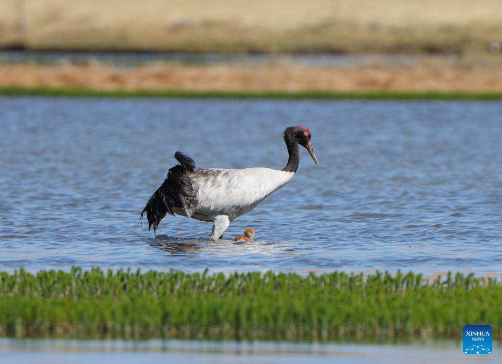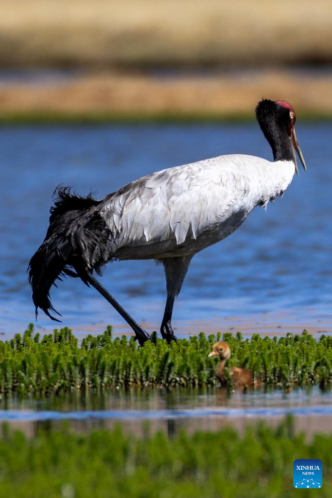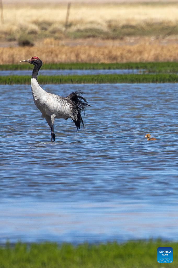A black-necked crane and its baby are seen at a wetland in Xainza County of Nagqu City, southwest China's Xizang Autonomous Region, June 9, 2024. Black-necked crane couples are breeding babies in wetlands at an altitude of about 4,700 meters in Xainza County. Every year around the time of June, pairs of black-necked cranes migrate to Xainza County to hatch eggs on grass piers surrounded by water. The black-necked crane, a species under first-class state protection in China, mainly inhabits plateau meadows and marshes at an altitude of 2,500 to 5,000 meters. (Xinhua/Jigme Dorje)